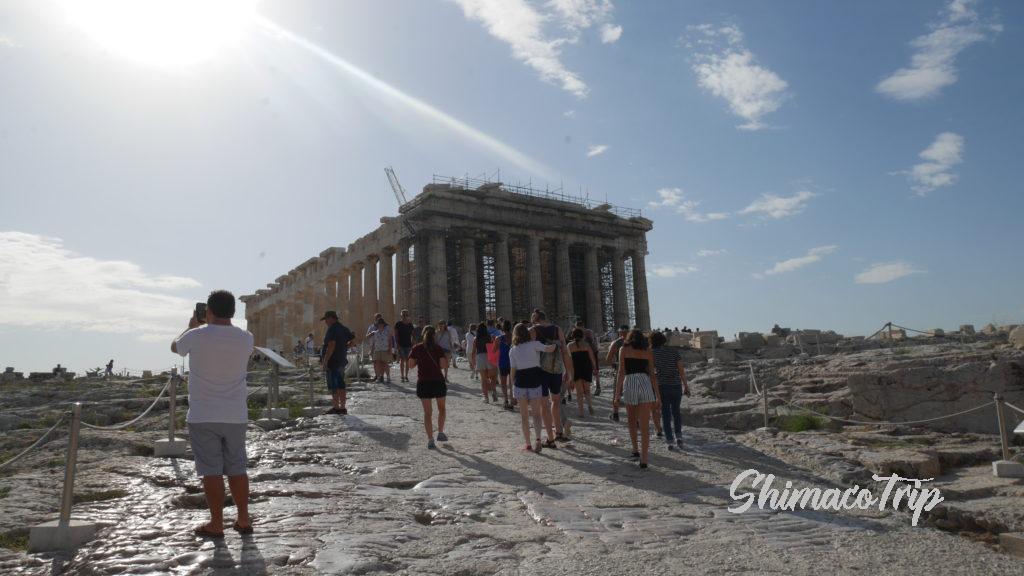 パルテノン神殿は、日差しをよける場所がないので、せめて・・・朝一がよいと思います。バッチリ暑いですけど。。逆に、夕方は日中にしっかり空気が予熱されて熱いので、恐らく朝よりシンドイのではと思います。陽が沈んだ後に、夜景を鑑賞しに行くのもありですね。