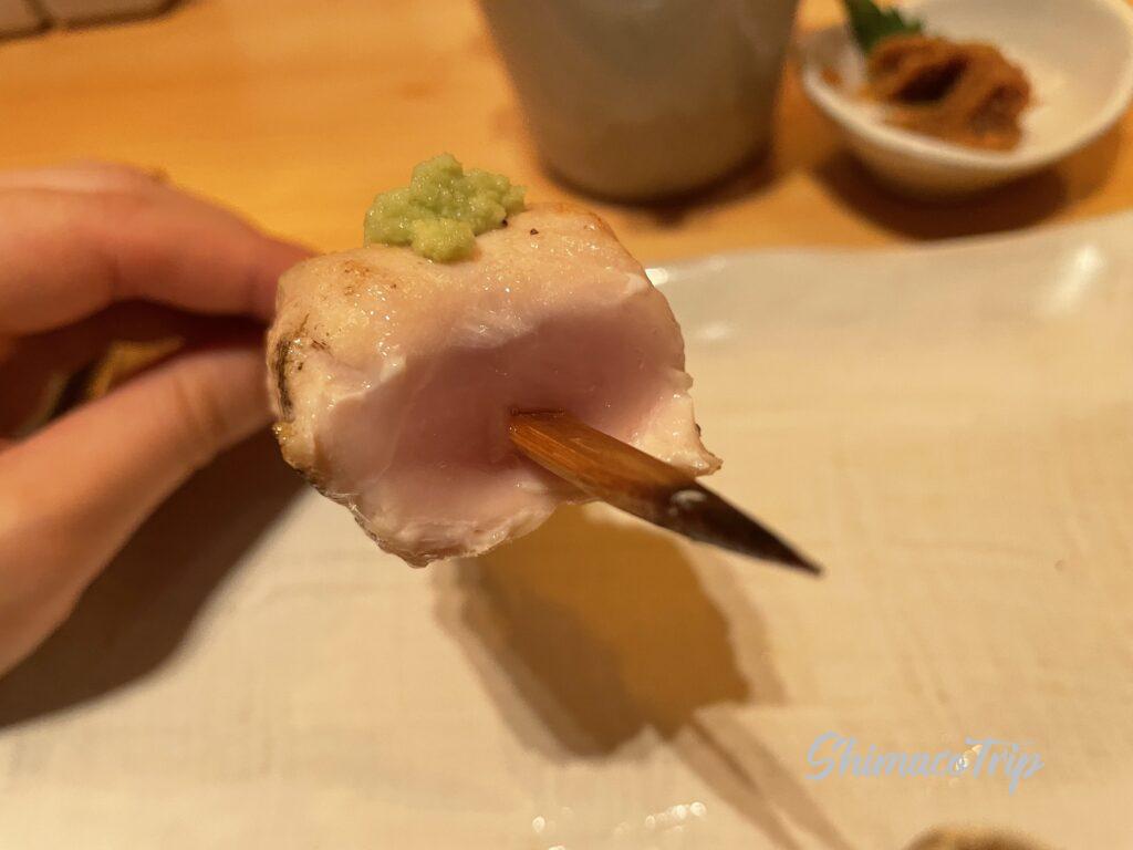 まずはささみ肉。柔らかいと思ったらレアでした。新鮮なので、鶏がレアで頂けちゃうのは産地ならでは楽しみでした。