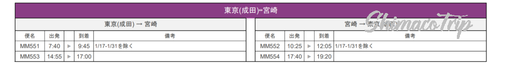 1か月前から予約できますが、1か月前の昼くらいになると満席になりますので注意が必要です(今回油断して予約できませんでした)。また、宮崎発1日2便かと思いきや、1便しか設定されていない日もありますので事前に乗りたい日が何便設定されているかを確認するのが良さそうです。