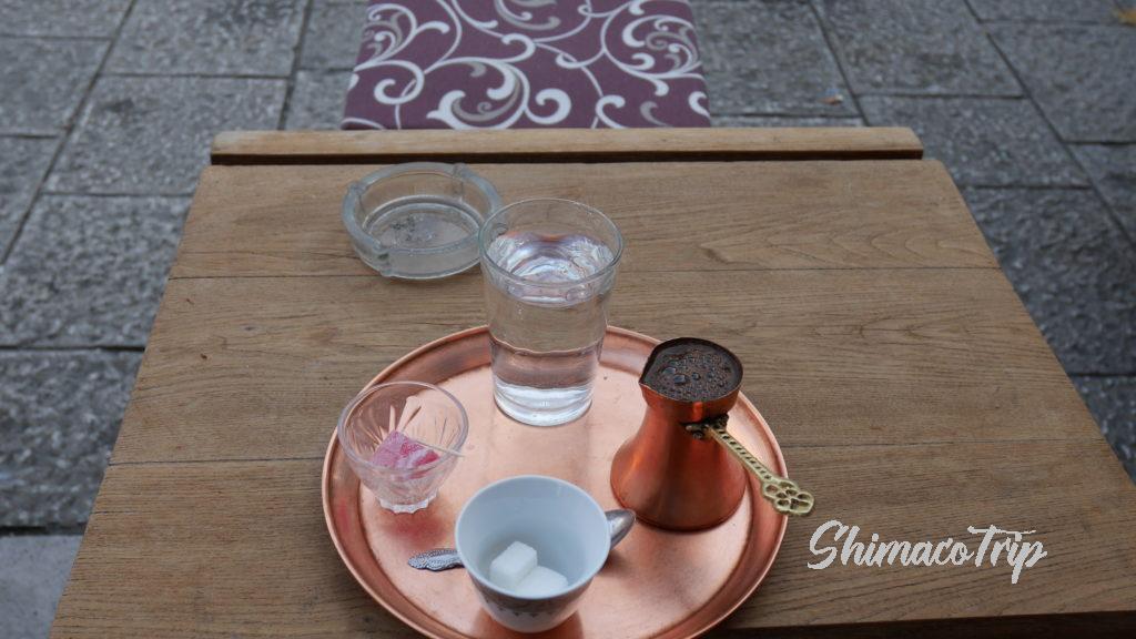 左に写っている砂糖のようなものはロクムターキッシュディライトとも言われるやつです。単品ではめちゃ甘いので苦手ですが、苦いボスニアン・コーヒーには相性ピッタリ