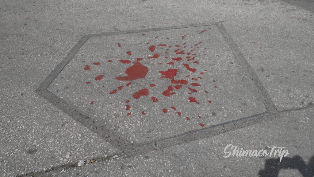 内戦時に射撃で亡くなった人のメモリアルが街中に多数存在します。コンクリートに窪みができるので、そこに赤いレジンを流して固めています。