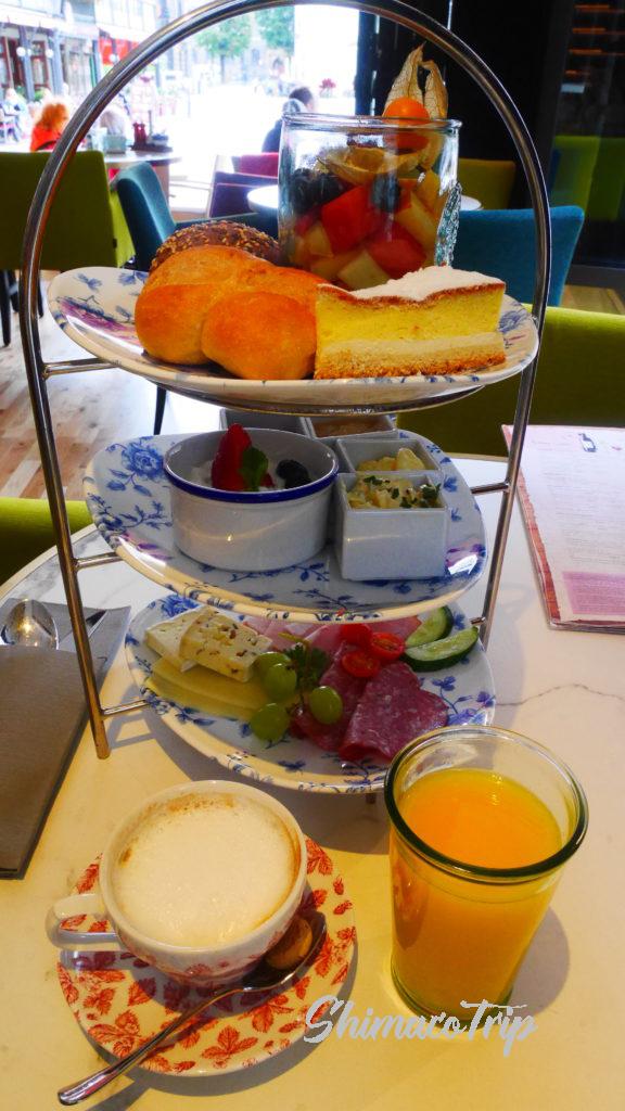 ホテルに朝食つけていないので朝食をとれる場所を探していたところ、ヒルトンのカフェの朝食が素敵そうだった。アフタヌーンティー風な朝食をとる。