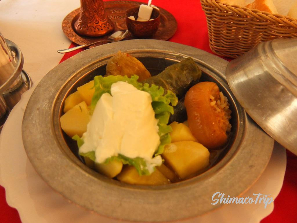 野菜の詰め物を煮込んだボスニアの料理、ドルマを注文しました。ヨーロッパ旅では、料理の量が多くて残してしまいがちなので、友人とシェアするつもりで1品頼むと意外とちょうどよい1人分で提供されました。はじめに量を聞けば良かったな。