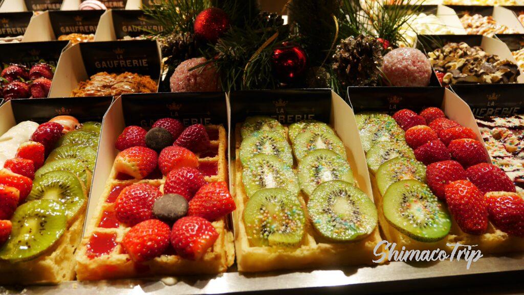 ブリュッセルは原宿のクレープ屋さんくらいワッフル屋さんが本当に沢山あって、どこの店でもこんな感じで売られています。ビジュアルの暴力すごい。