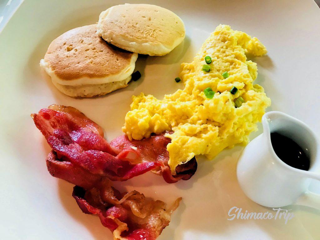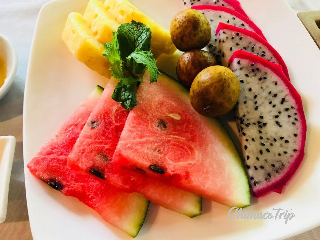 朝食はフルーツプレート。オーダー式で卵料理を作ってくれる。