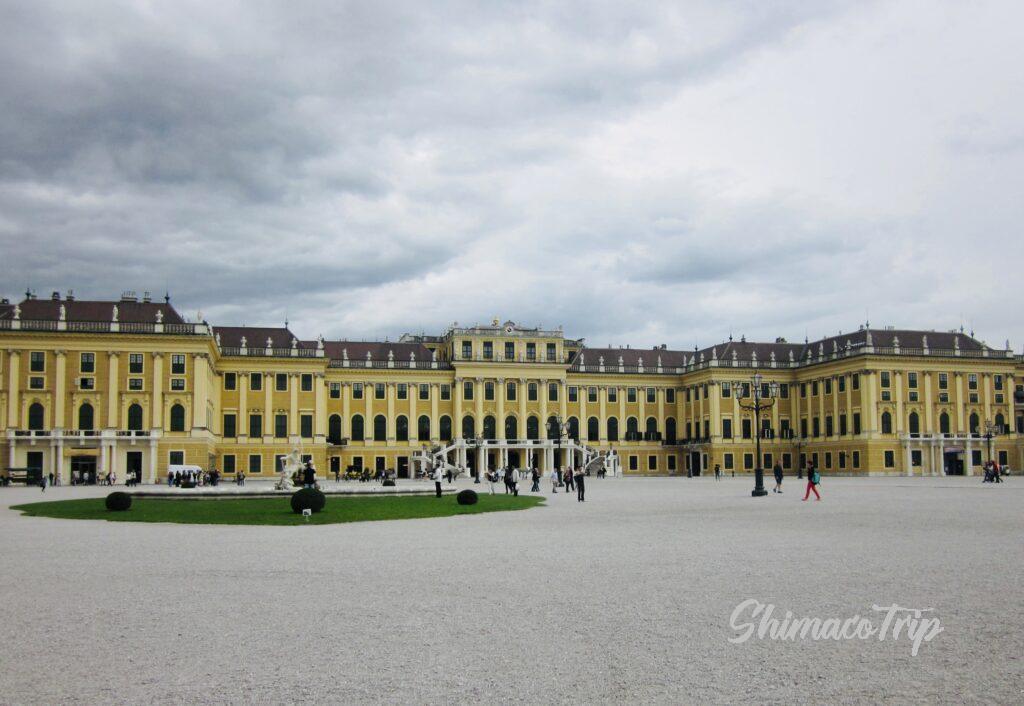 ハプスブルク家カラー、シェーンブルン・イエローのゴールド系のイエローというか、絶妙な色の外壁が引き立ちますね。(ちょっと天気悪くて残念)