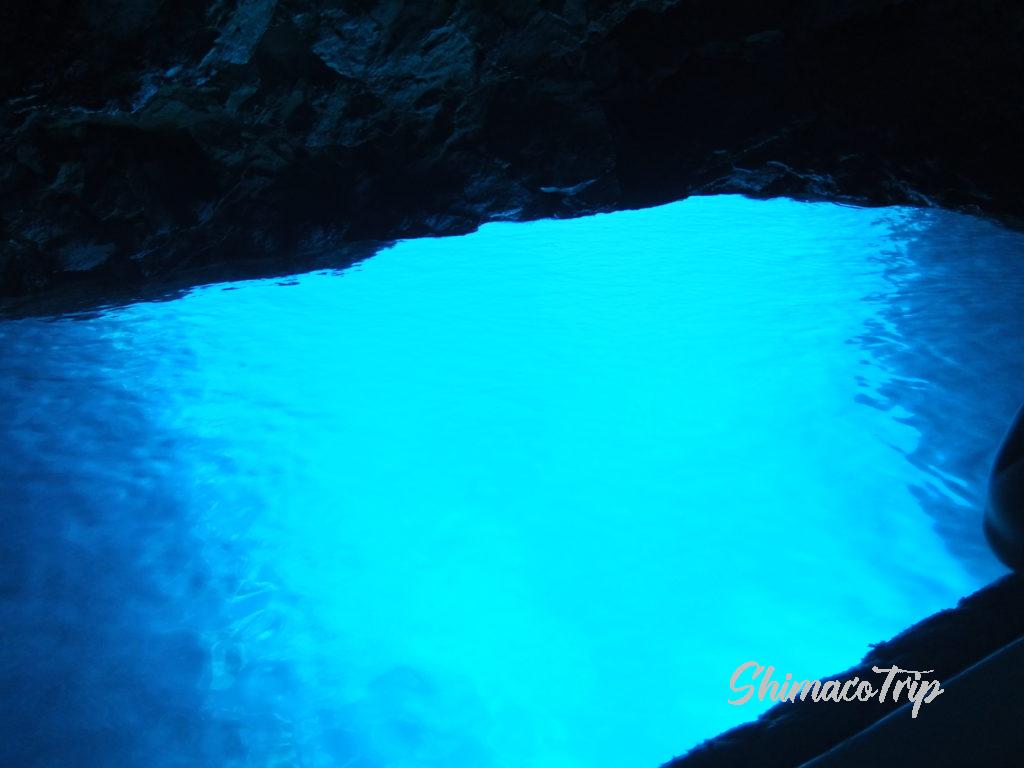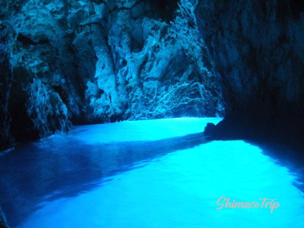 洞窟の入り口で全員屈んで、いよいよ洞窟に入ります。はじめは暗いのですが、奥に進むにつれ徐々に幻想的な青い光が。写真で表現しきれない美しさで、こんな私の写真は参考程度にして、是非実物を見てほしいと思います