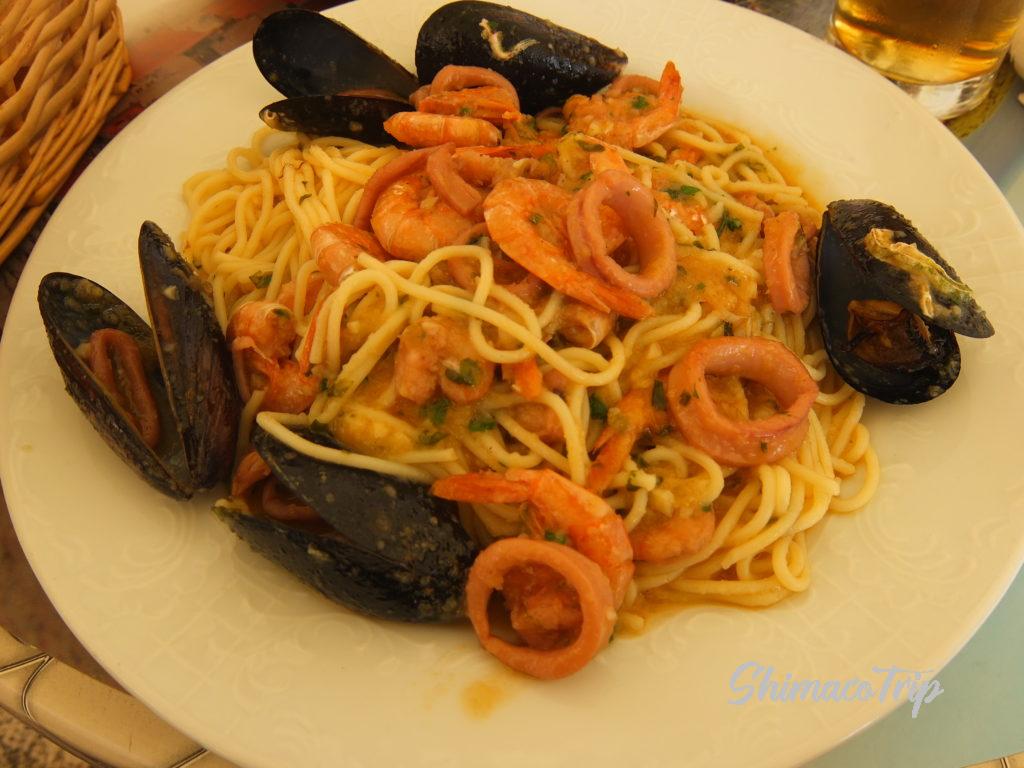 適当に入ったお店で、パスタとオクトパスサラダを注文。シーフードパスタは大雑把ながらニンニクと海鮮の旨味がすごい。