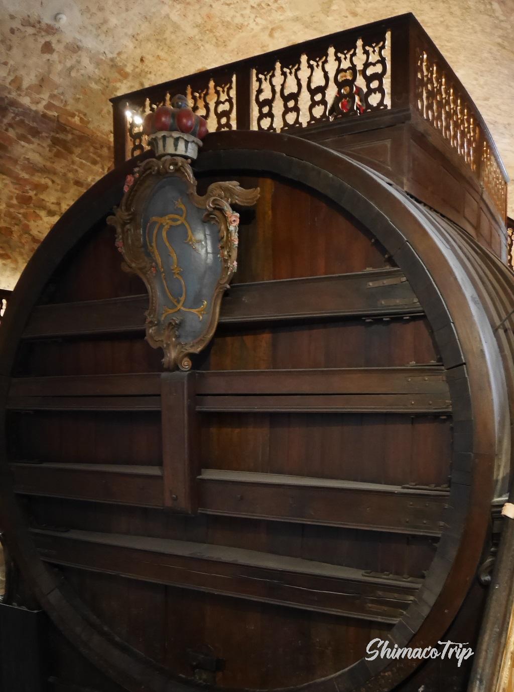 見所の一つ、世界一大きいとされるワイン樽。そばにワインバーも併設されている。