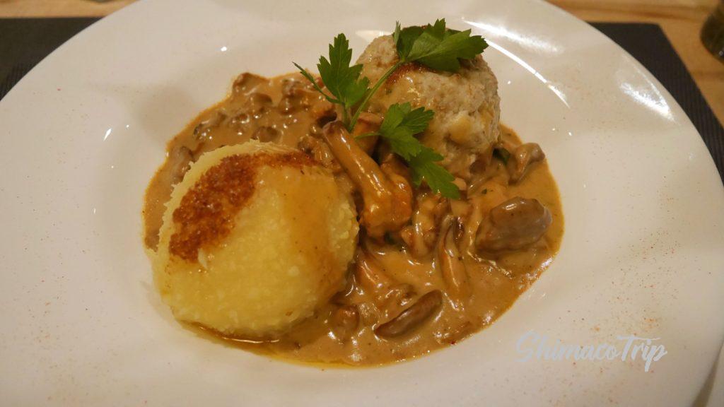 ジャガイモのダンプリングにキノコクリームをかけたものと骨付きチキンを注文した。サラダも注文しようとしたら量が多いからメイン1つがいいよ、野菜はついているからと。