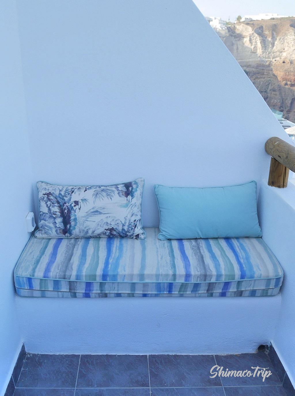 バルコニーにはソファもあって、海を見ながらのんびり過ごせます。サントリーニワイン買ってバルコニーで飲んだり。