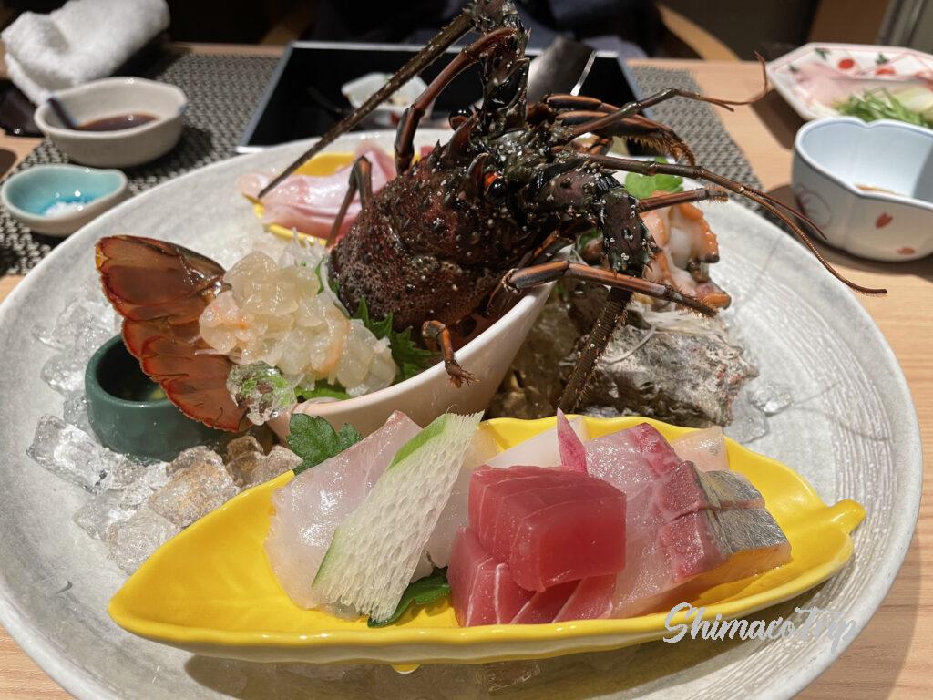 刺身盛り合わせ。イセエビが弾力あって美味しい。この宿の面白いところは、その日入ってきた4種類くらいの魚介から好きなものを1人2種類選んでお刺身にしてくれます。す、素晴らしい。