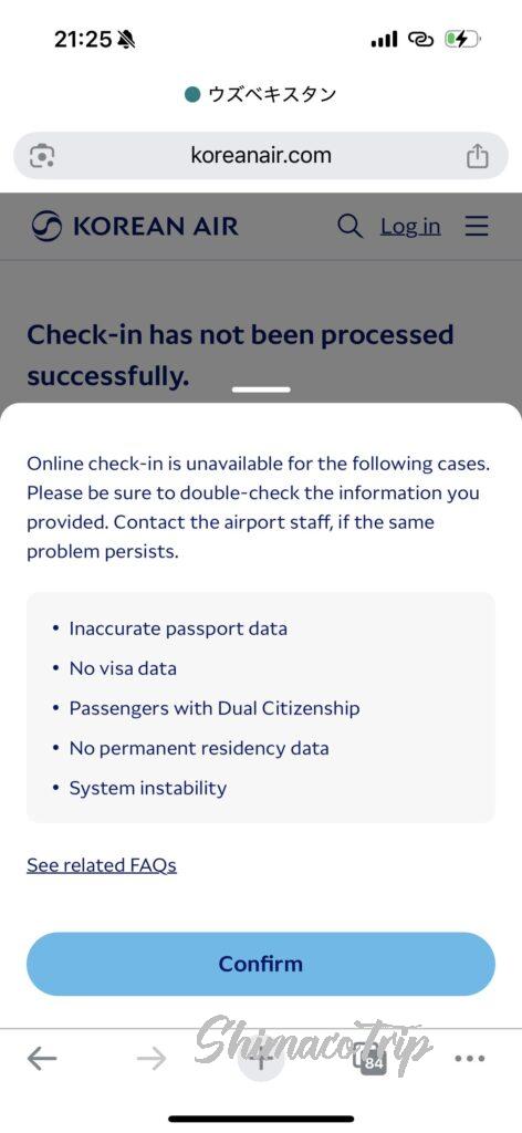 なぜなら、ウズベキスタン航空も大韓航空もオンラインチェックインができなかったから。