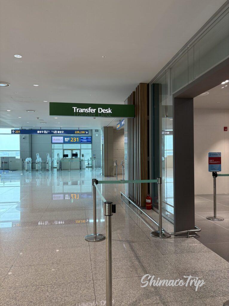 到着ゲートが離れていたのか、保安検査込みでT1への移動に40分くらい掛かりました。トランスファーデスクがAsianaとOtherがあり、Other Airlinesに向かうが時刻は5:30くらいで誰もいない。