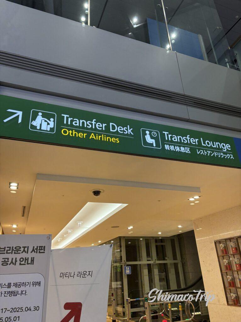 大韓航空のTransfer Deskの標識を見ながら大韓航空のトランスファーデスクに向かいます。T2では4Fに通じるエスカレーター手前付近にありました。