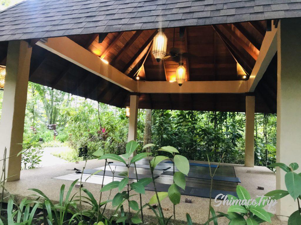 ジャングルの中のヨガパビリオンで30分〜1時間の無料のヨガクラスが行われます。