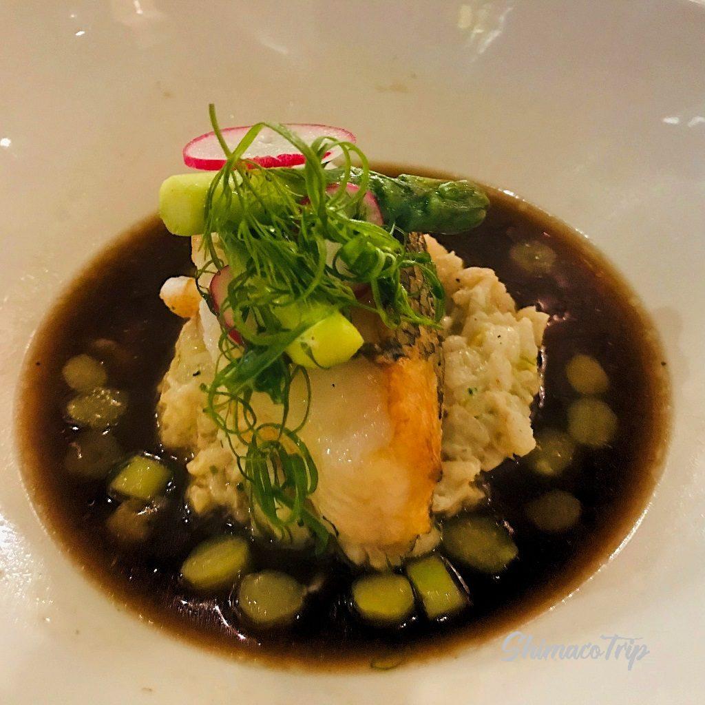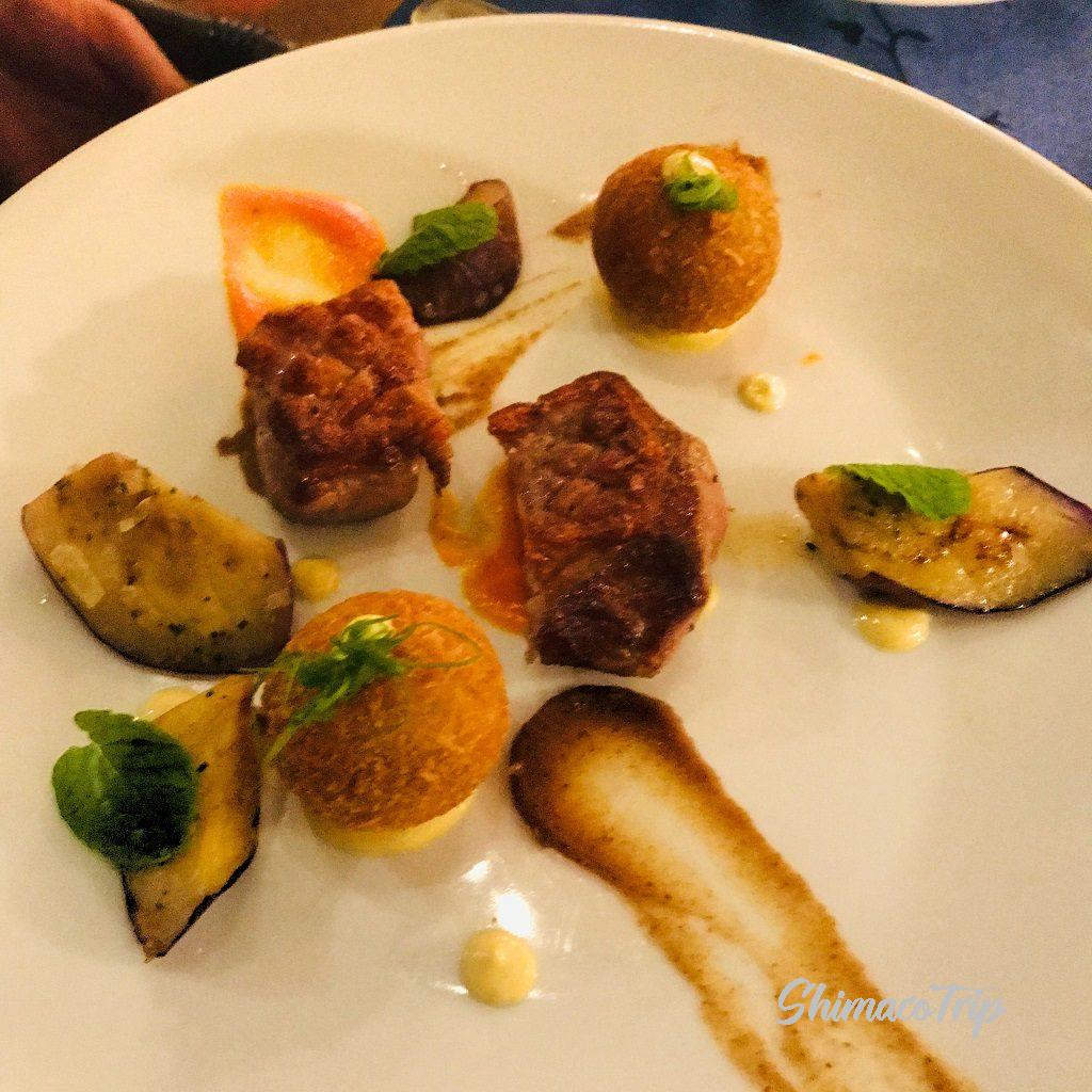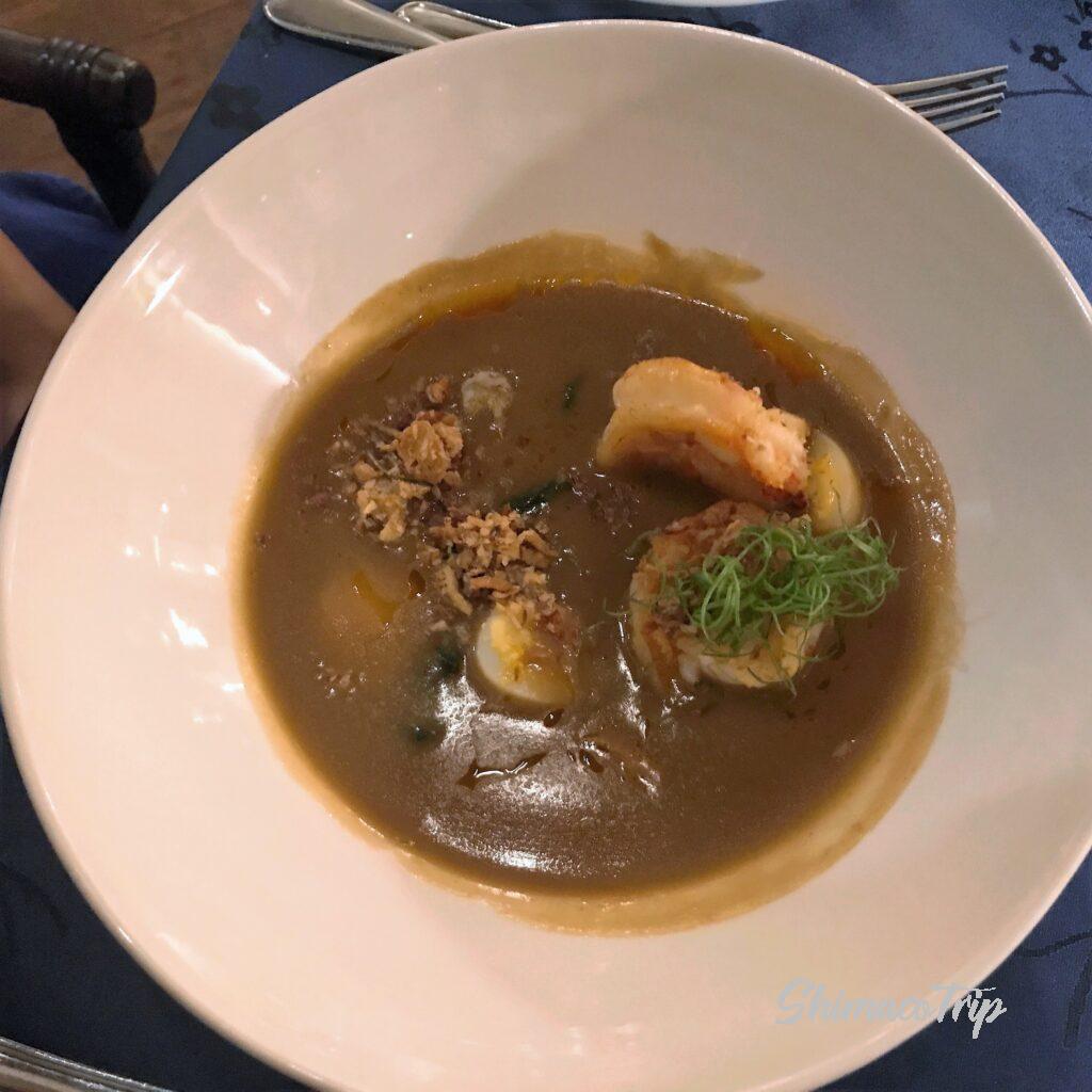 前菜に(多分)ドライ・ラクサといってスープではなくてラクサの風味のする創作料理、スープ系のお料理、本日のお魚料理とステーキ&フリットの4皿でした。