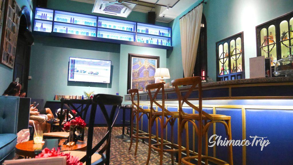 食後は1階にあるバーに移動します。こちらもブルー基調で静謐な佇まい。