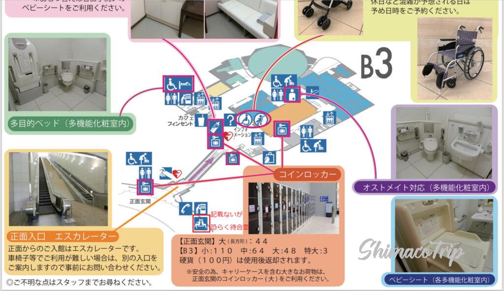 コインロッカーは100円で返却時に戻るタイプのロッカーで、- 建物外にはキャリーケース用