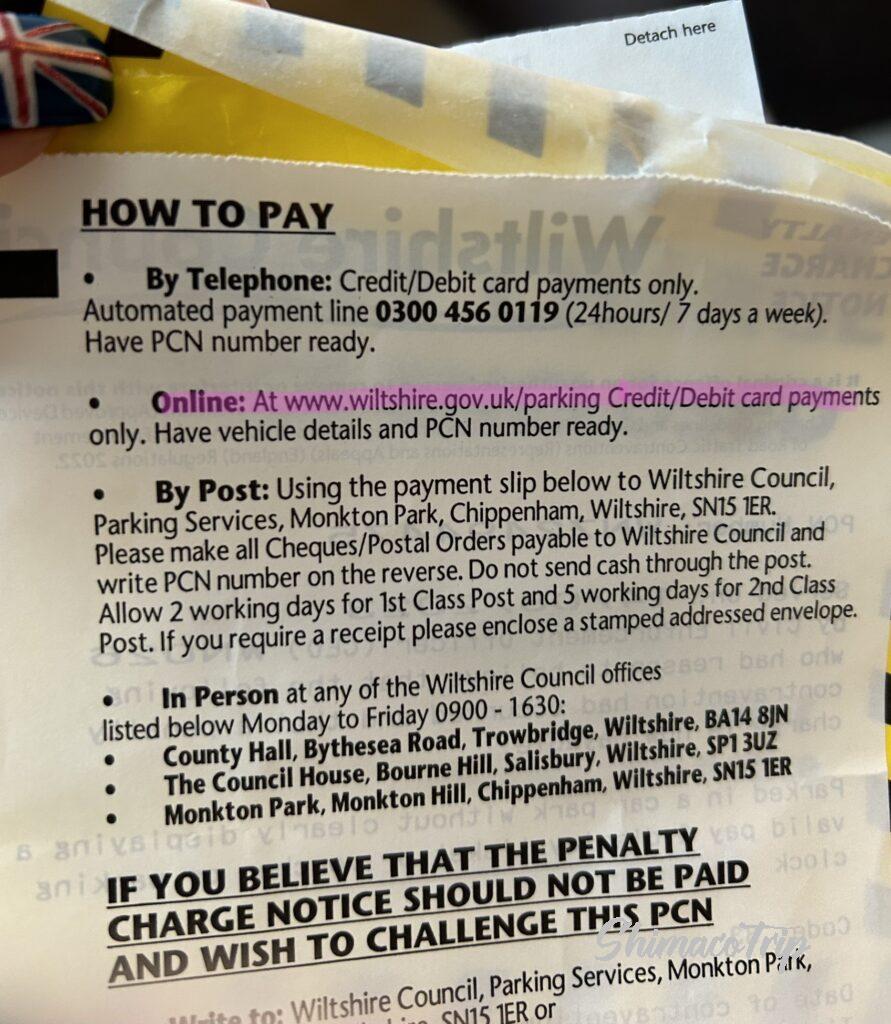 違反切符の裏面に支払い方法のオプションが記載されています。