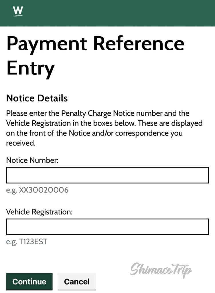 違反切符に印字されたNotice Numberと、Vehicle Registrationは車のナンバープレートの番号なので、その2つを入力して