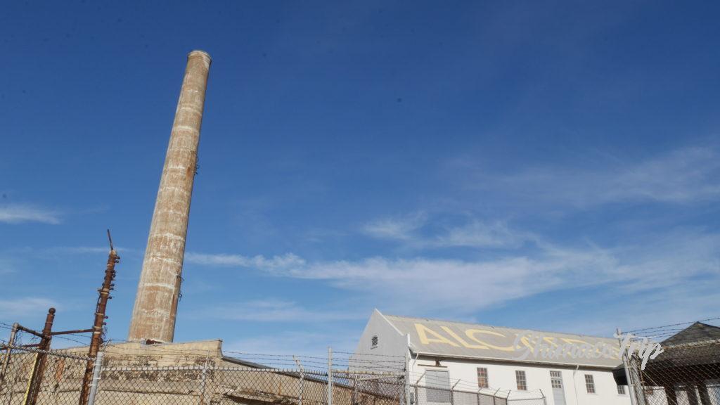 こちらの煙突や倉庫?は見学コース外で、格子の向こうには行けませんが写真はOKです。